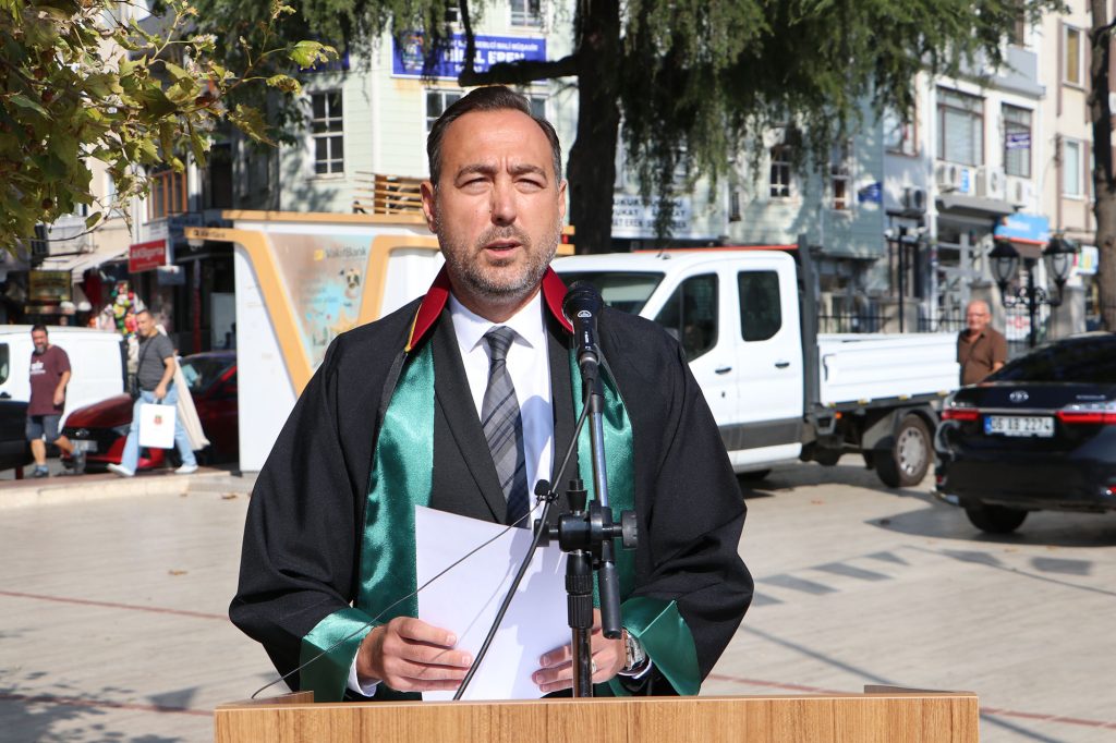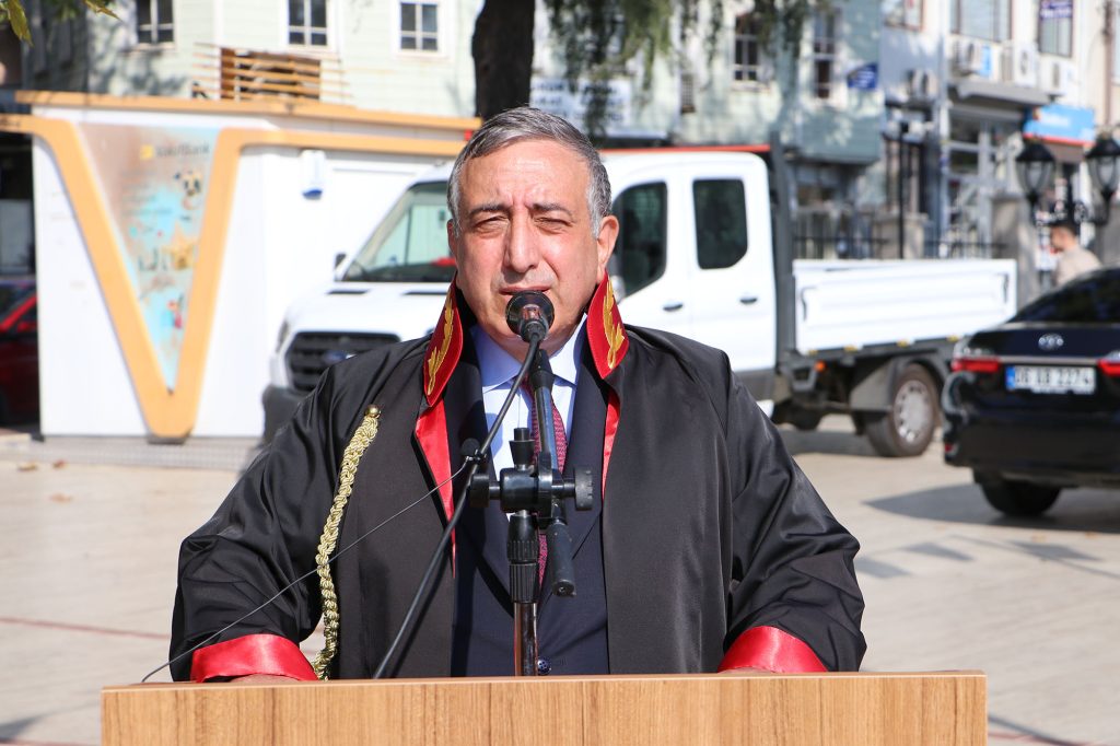 Çelenk sunma töreninde konuşan Bölge Adliye Mahkemesi Başsavcısı Ünal Bingül; ‘’Değerli meslektaşlarım, ailelerinizle birlikte sağlıklı, huzurlu, mutlu bir yeni adli yıl diliyorum. Her şey gönlünüze göre olsun.’’