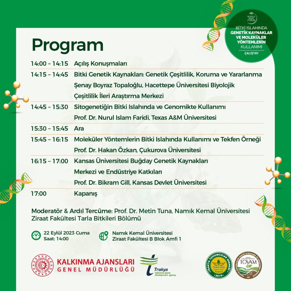 Saat: 14:00’da açılış konuşmaları ile başlayacak çalıştayda önemli isimler konuşmacı olacak. Bitki Kaynakları, Genetik Çeşitlilik, Koruma ve Yararlanma hakkında sunum yapacak olan  Hacettepe Üniversitesi Biyolojik Çeşitlilik İleri Araştırma Merkezi’nden Şenay Boyraz Topaloğlu sunum yapacak. Daha sonra Sitogenetiğin Bitki Islahında ve Genomikte Kullanımını  Texas A&M Üniversitesinden Prof. Dr. Nurul İslam Faridi konuşmacı olacak. Saat:15:45’de Moleklüler Yöntemlerin Bitki Islahında Kullanımı ve Tekfen Örneği Çukurova Üniversitesinden Prof. Dr. Hakan Özkan tarafından anlatılacak. Çalıştayın son konuşmacısı Kansan Üniversitesi Buğday Genetik Kaynakları Merkezi ve Endüstriye Katkıları konusuyla Kansas Devlet Üniversitesinden Prof. Dr. Bikram Gill olacak.