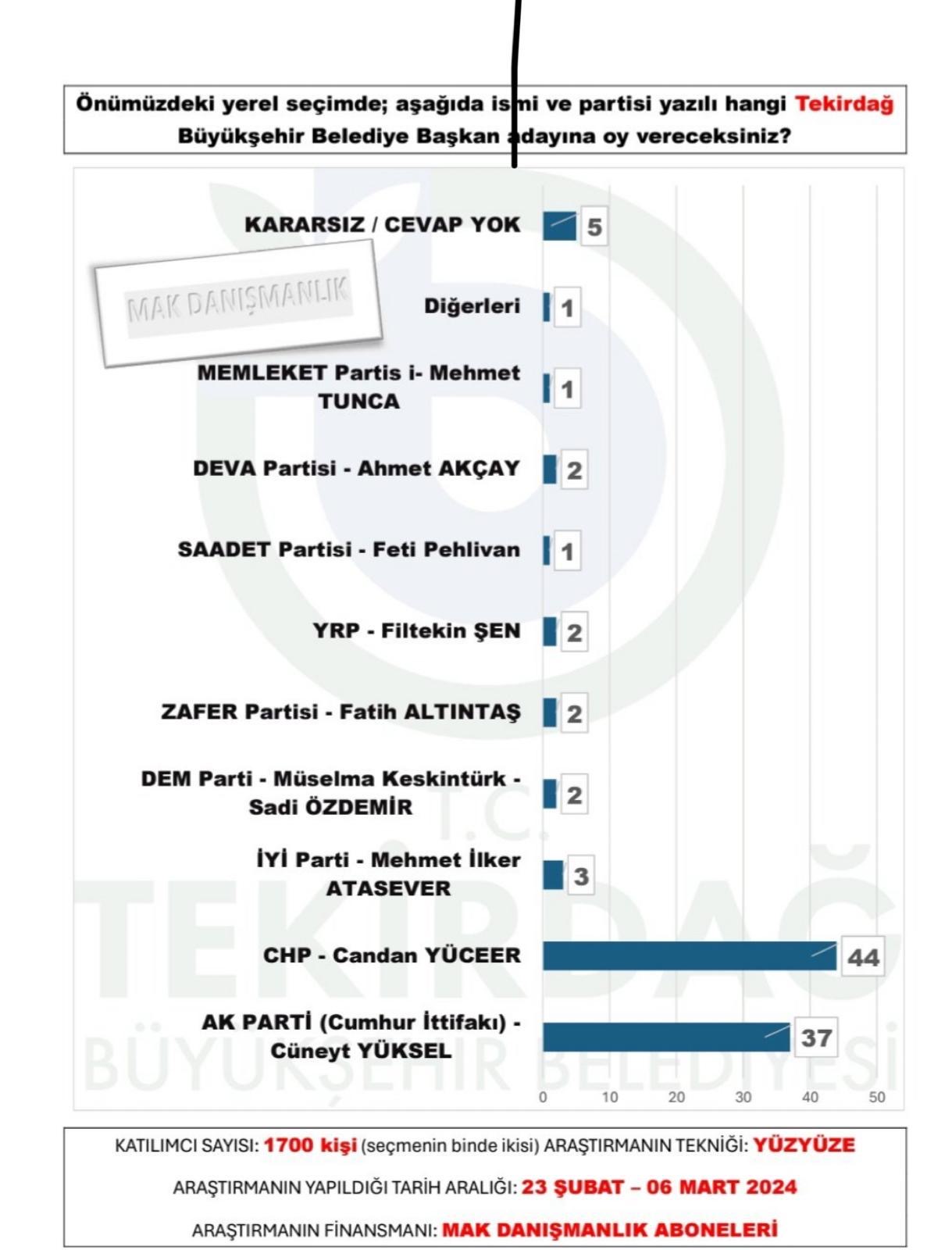 MAK Danışmanlık’ın 21 Şubat-9 Mart büyükşehirler anketine göre Tekirdağ’da birinci çıkan ismin yüzde 44 ile CHP Tekirdağ Büyükşehir Belediye Başkan Adayı Dr. Candan Yüceer olduğu gözüküyor. Cumhur İttifakı Adayı Cüneyt Yüksel ise yüzde 37’lik oy oranında kaldı. 23 Şubat- 6 Mart tarihlerinde Tekirdağ seçmeninin binde ikisini oluşturan bin 700 kişi ile yüz yüze yapıldı.