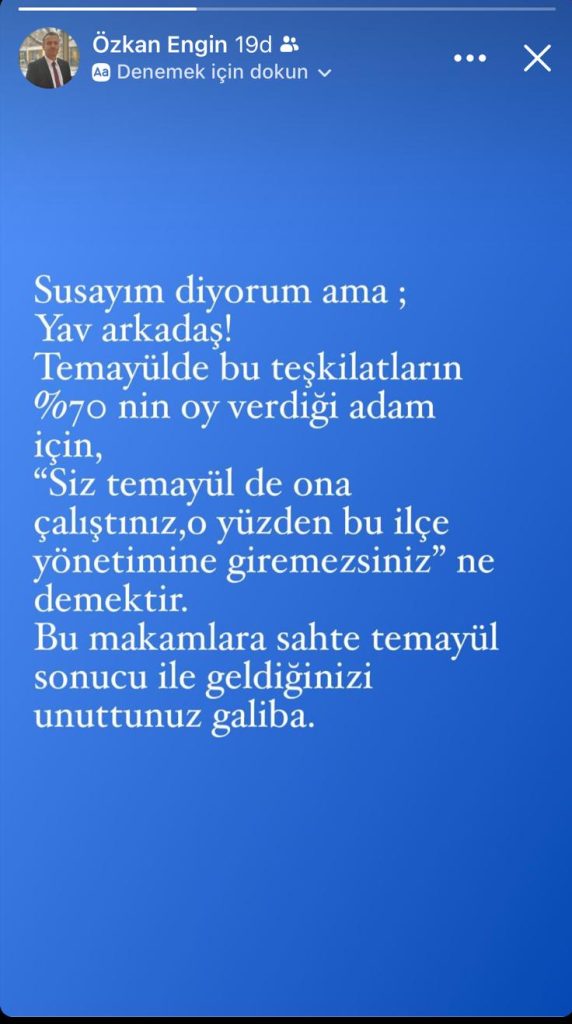 AK Parti’de önceki dönem İl Başkan Yardımcılığı yapan Özkan Engin, Facebook durumundan teşkilatlara göndermede bulundu.  İlçe yönetimlerinin oluşturulduğu dönemde parti içi ayrımcılık yapıldığına işaret eden Engin, Facebook durumunda ”Susayım diyorum ama; Yav arkadaş! Temayülde bu teşkilatların %70’nin oy verdiği adam için, ‘Siz Temayülde ona çalıştınız, o yüzden bu ilçe yönetimine giremezsiniz’ ne demektir.” diyerek isyan etti.