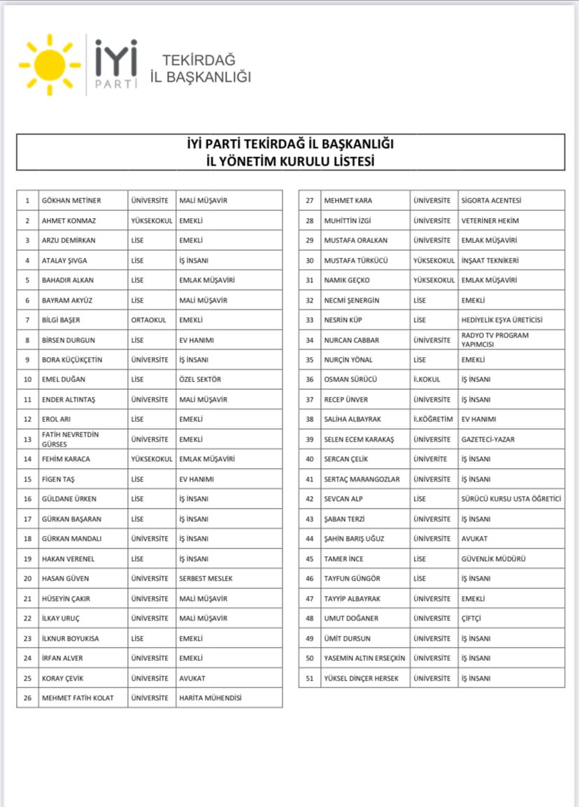 İYİ Parti Tekirdağ İl Başkanlığı yerel seçimlerin ardından sesizliğe bürünmüş ve yeni yönetim kurulu çalışmalarına başlamıştı. Genel Merkez tarafından onaylanan yeni yönetim kurulu listesi belli oldu.