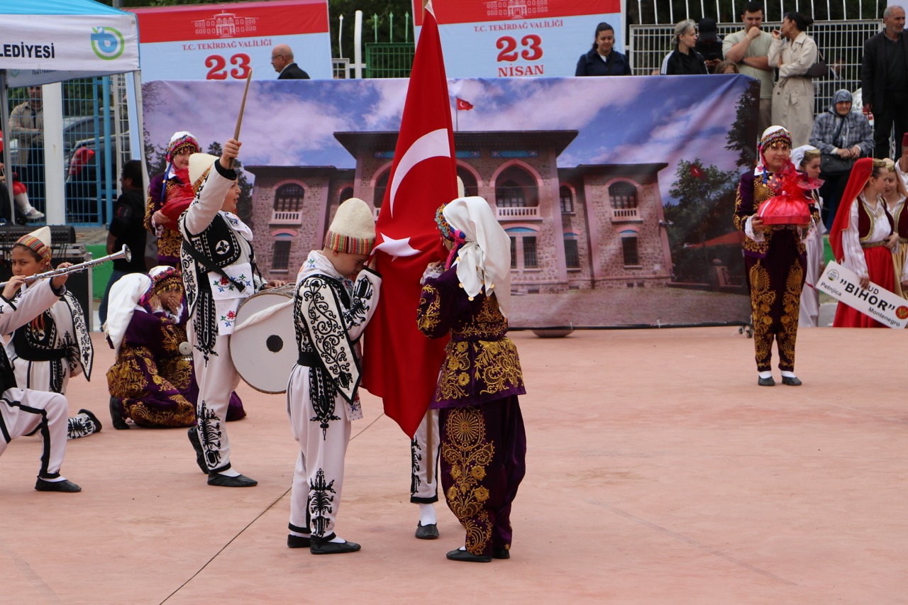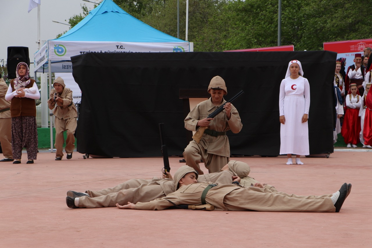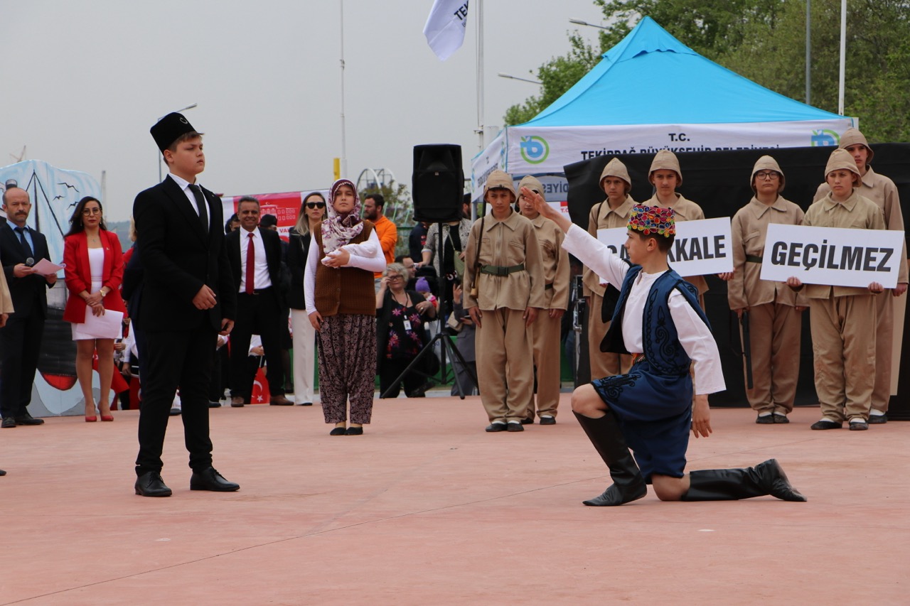 Öğrenciler, Türkiye Cumhuriyeti’nin kuruluş ve milli mücadele yıllarında yaşanan zorlukları anlatan tiyatro ve gösterileri ile izleyicilere duygulu anlar yaşattı. Programda balkan ülkelerinden gelen öğrenciler geldikleri ülkeleri halk oyunlarını sergiledi. Türkiye’nin farklı yörelerindeki halk oyunlarının sergilendiği programda, miniklerin gösterileri izleyicilerden büyük alkış aldı. Gerçekleştirilen törene Tekirdağ Valisi Recep Soytürk, Tekirdağ Garnizon Komutanı Tuğgeneral Ahmet Uğurlu, Tekirdağ Milletvekilleri Mestan Özcan, İlhami Özcan Aygun, Tekirdağ Büyükşehir Belediye Başkanı Candan Yüceer, Süleymanpaşa Belediye Başkanı Volkan Nallar, Siyasi parti temsilcileri katıldı.