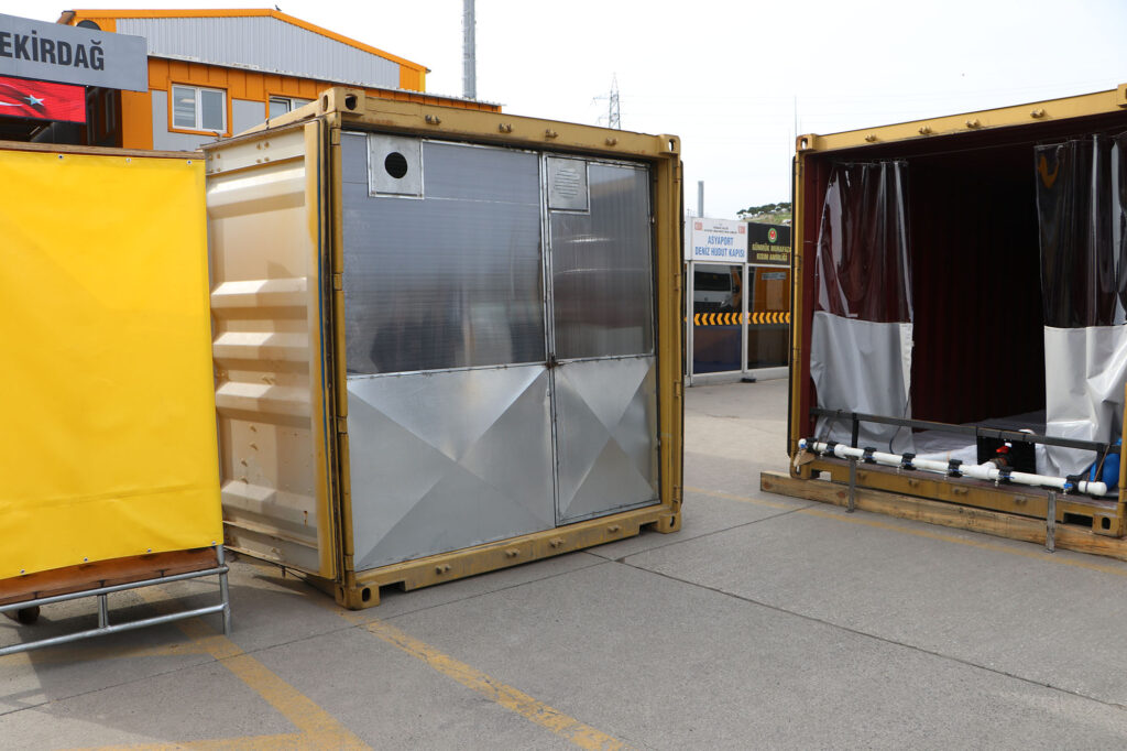 Türkiye’nin en büyük transit konteyner limanı Asyaport ülkemizi vuran depremin ardından yük taşımada kullanılan konteynerlerin anında barınma merkezine dönüşebilmesi için örnek bir proje hazırladı. Konteynere yapılan bir ekleme ile konteynerler içinde barınabilecek bir hale geliyor. Projeye ek olarak portatif sahra tuvaleti ve yine içme suyu depo sistemi eklendi. Bu sayede Tekirdağ’da dört bir yanında bulunan konteynerler olası bir depremin ilk dakikasından itibaren geçici olarak tahsis edilerek içinde kalınabilecek bir duruma geliyor.